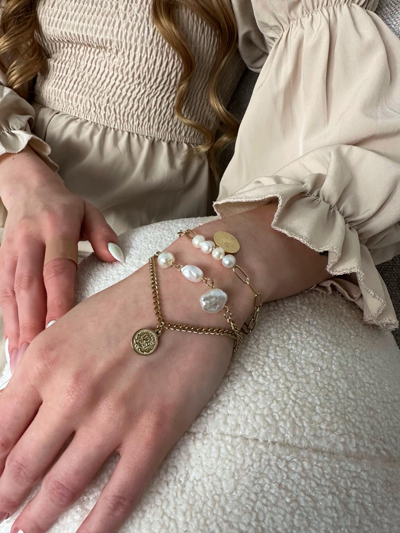 Złoty kolor bransoletki nadaje jej luksusowy i elegancki wygląd, który doskonale komponuje się z różnorodnymi stylizacjami, od codziennych po bardziej formalne. Delikatne białe perełki dodają bransoletce subtelnego blasku i klasy, tworząc harmonijny kontrast z ciepłym odcieniem złota.