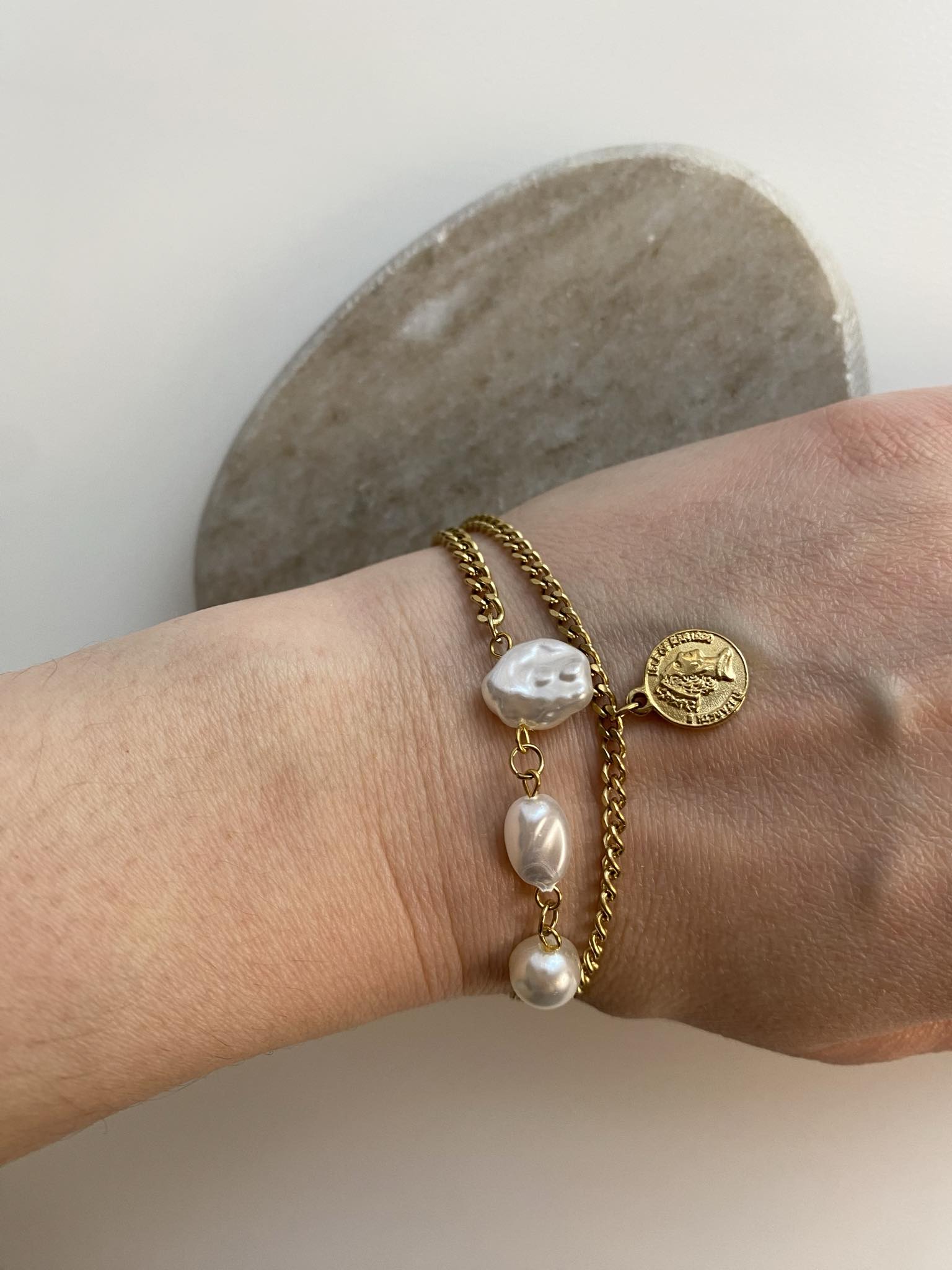 Podwójny łańcuszek nadaje bransoletce nowoczesny i stylowy charakter, zapewniając jednocześnie jej wytrzymałość i wyjątkowy wygląd. Subtelny łańcuszek z perełkami to elegancki detal, który przyciąga wzrok i podkreśla piękno nadgarstka.